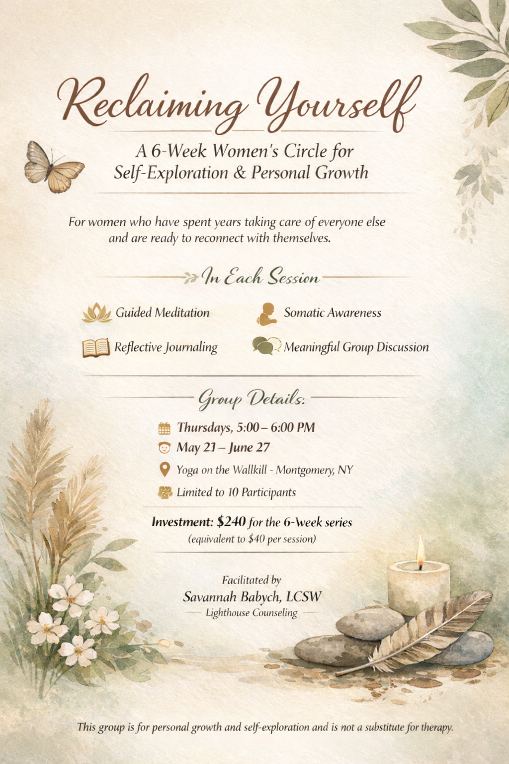 Reclaiming Yourself is a 6-week women’s circle designed to create intentional space to slow down, turn inward, and reconnect with yourself.